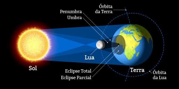 Os eclipses solares podem ser parcial ou total. Quando apenas parte do disco solar é encoberto pela Lua temos o eclipse parcial. Quando todo o disco solar é encoberto por nosso satélite, temos o eclipse parcial.