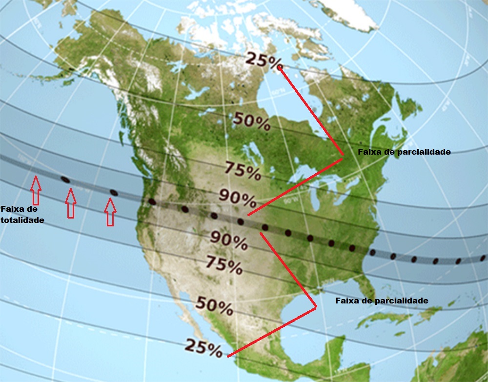 A sombra da Lua projetada na Terra, como é possível deduzir, não fica fixa, ela percorre a superfície do planeta a uma velocidade de 4000 km/h e tem uma extensão de cerca de 250 km. A região mais escura da sombra se chama umbra e o caminho que ela faz determina a região da totalidade do eclipse. Já o caminho percorrido pela penumbra, região mais tênue da sombra, determina a faixa de parcialidade, onde é possível ver o eclipse parcial do Sol.